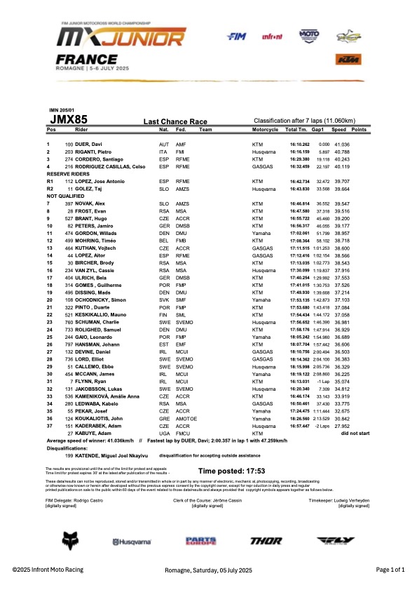 JVM i motocross, som i år avgörs i franska Romagne, inleddes under lördagen med tidskval. Och sex av tio startande svenskar tog sig vidare till söndagens finaler. Tyvärr bara en i 85–klassen, där Max Lindström slutade på en 15:e plats i B–gruppen. Övriga blågula förare placerade sig inte bland de 18 bästa och åkte sedan ut i Sista Chansen-heatet. I 125-klassen däremot såg vi flera blågula glädjeämnen; Alve Callemo imponerade mest med en femte bästa tid. Casper Lindmark, Gustav Axelsson och Hugo Bergqvist tog sig också vidare direkt från tidskvalet. Och sedan landade Dante Lantz på tredje plats i Sista Chansen-heatet, för ett femte svenska avancemang. Tyvärr fanns inga svenska förare med i 65–klassen. Här är samtliga resultat från lördagens kval!